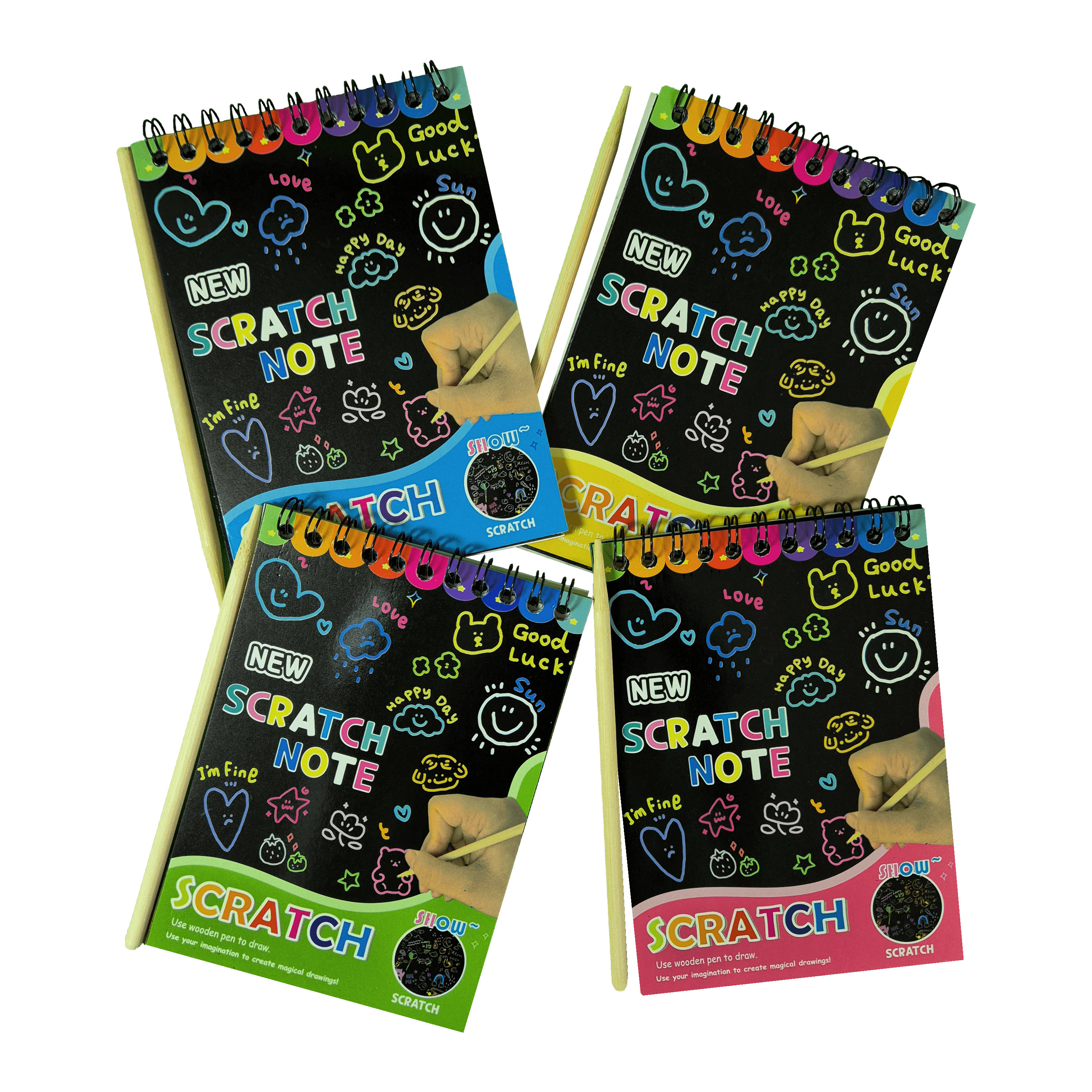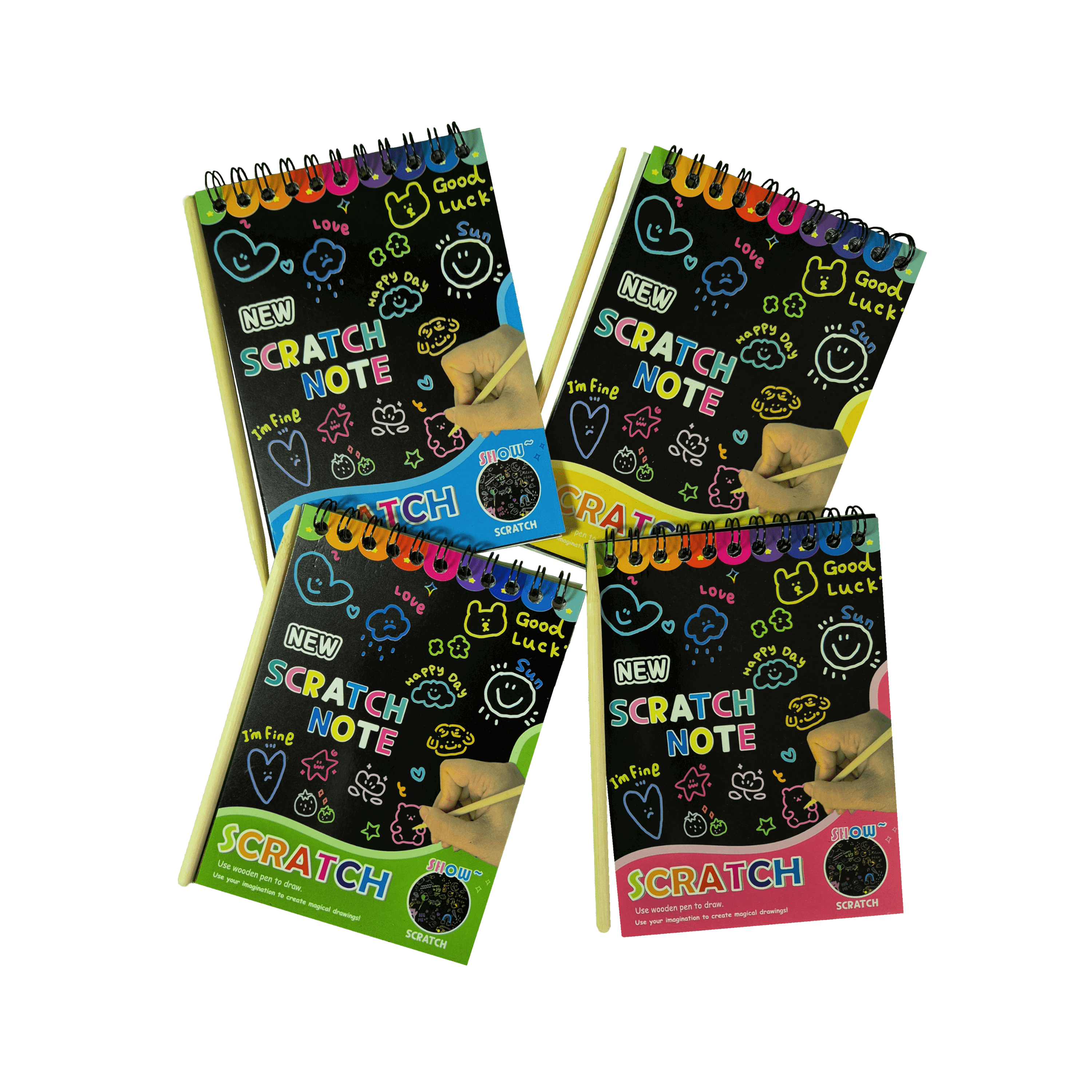 Cada hoja parece negra, pero al rasparla con la varita especial, va apareciendo un fondo multicolor lleno de magia. Ideal para dibujar, hacer garabatos, dejar mensajitos o simplemente liberar el estrés del día a puro color.