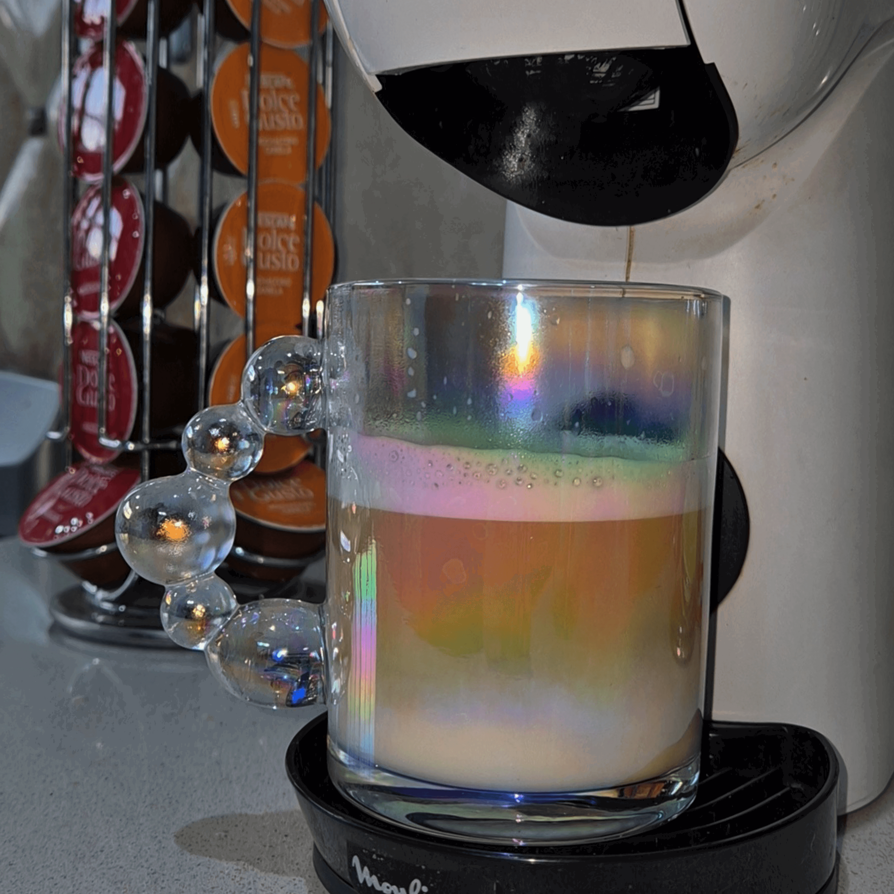 ¿Café con estilo? ¿Té con buena vibra? Esta taza de vidrio iridiscente es una joyita de diseño que transforma cualquier bebida en una experiencia aesthetic 🌟 Es de esas tazas que una vez que la tenés... ya no querés usar otra. Minimalista, mágica y con toda la personalidad.