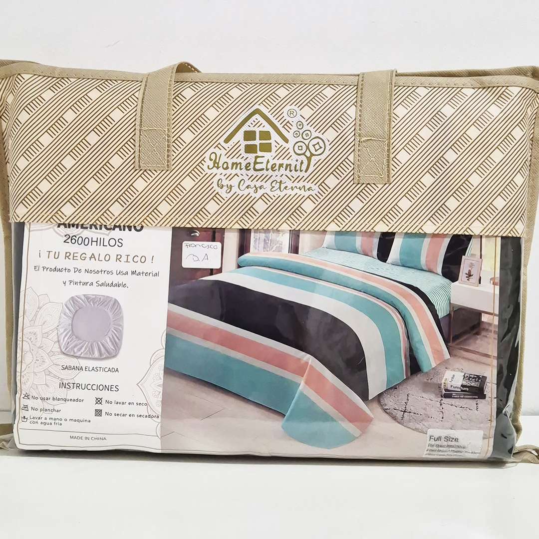 Juego de Sabanas FULL SIZE Rayas Celeste con Naranja