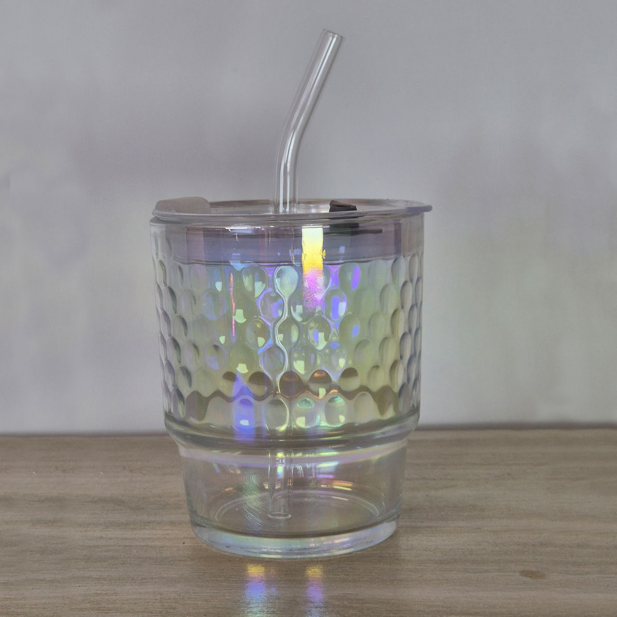 Este vaso iridiscente es un espectáculo en sí mismo. Cambia de color con la luz, tiene textura tipo panal y además viene con su propia bombilla de vidrio reutilizable. Ideal para jugos, licuados, agua saborizada o ese frappe que tanto amás.