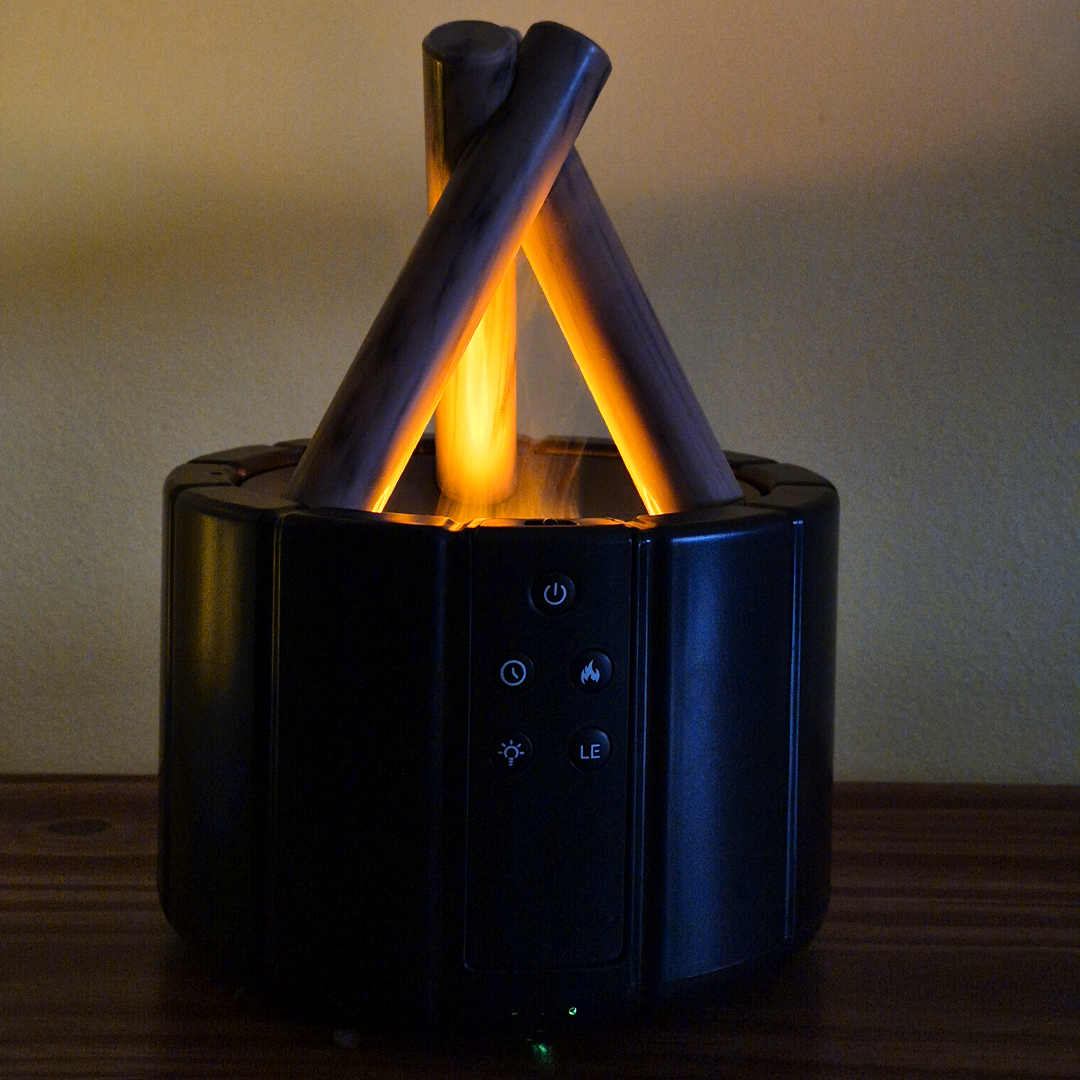 Dale un toque único y acogedor a tu casa con este humidificador con diseño de fogata. Sus luces LED simulan las llamas del fuego, creando un ambiente cálido y relajante, ideal para usar en el living, dormitorio o cualquier espacio que quieras transformar.
