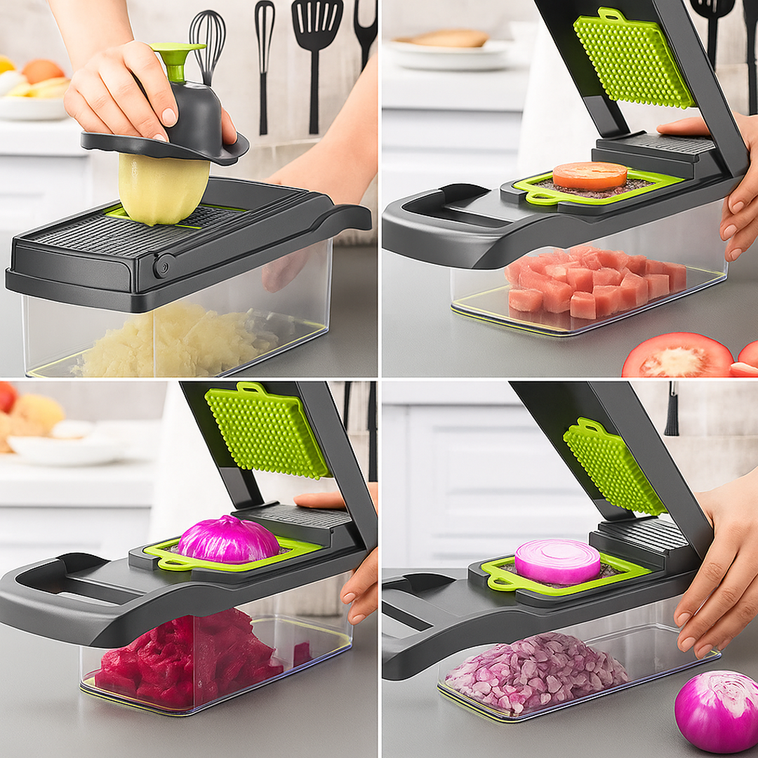 ¡El aliado perfecto para tu cocina! Con esta mandolina multifunción vas a poder cortar, rebanar, rallar y picar todo tipo de verduras y frutas en segundos. Ideal para ahorrar tiempo y darle un toque profesional a tus comidas.